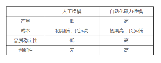 自動化已成為當今世界各國技術創新和經濟發展競爭的焦點;從大家提及的自動化生產單元、自動化生產線、無人車間、黑燈生產、以及所謂的“機器換人”等話題皆為自動化,似乎工廠無自動化設備就不與時俱進了。當然注塑機磁力換模也由傳統換模方式【人工換模】改進為【自動化磁力換模】了,下面表格為人工換模與自動化注塑機磁力換模的對比: